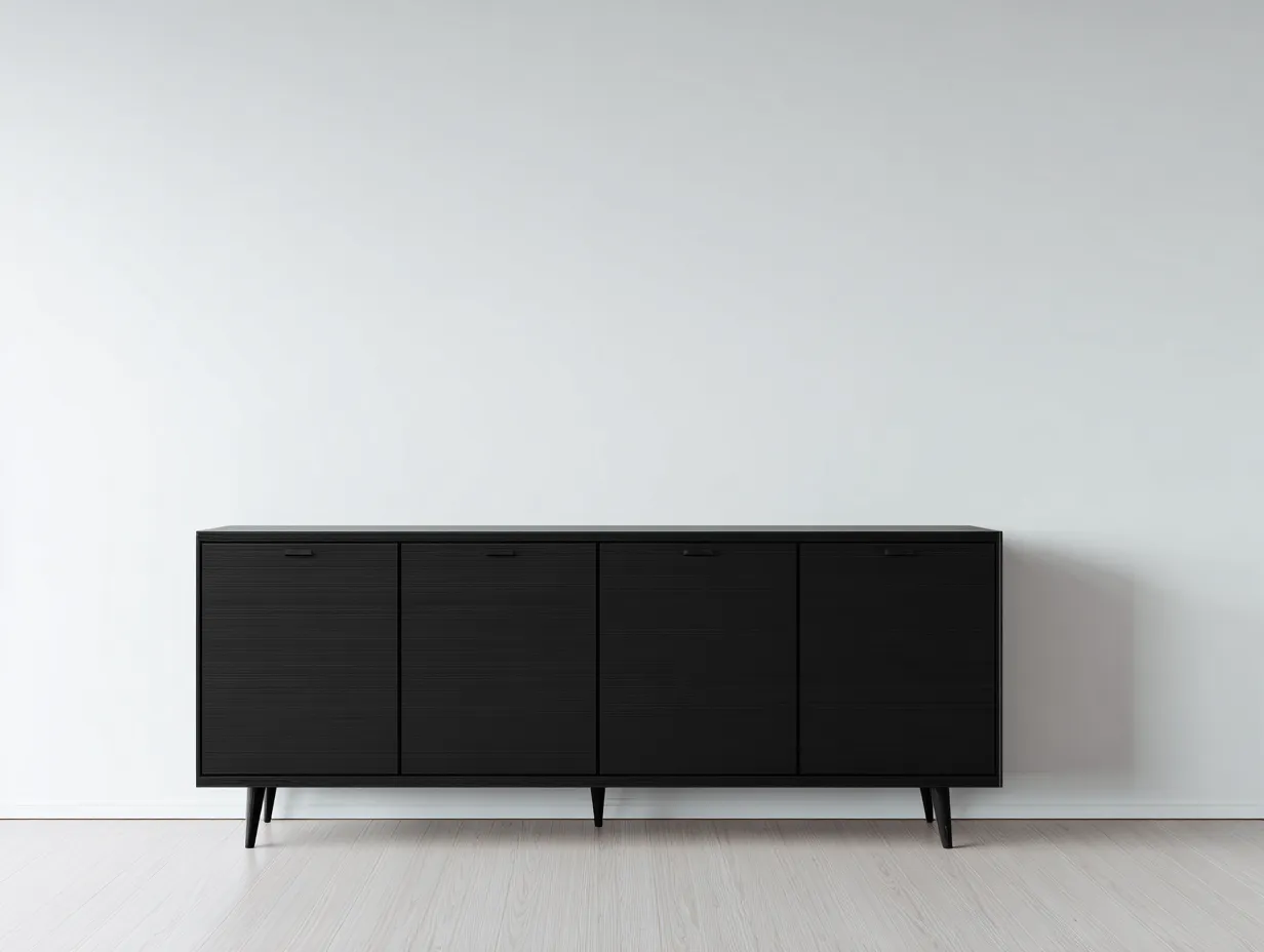 Gefertigt aus Holzwerkstoff und Metall bietet der Schrank eine stabile Konstruktion und eine langlebige Oberfläche. Die schwarze Ausführung wirkt zeitgemäß und lässt sich gut mit unterschiedlichen Möbeln kombinieren. Die Metallfüße sorgen für einen sicheren Stand und verleihen dem Möbelstück eine leichte, moderne Erscheinung.
